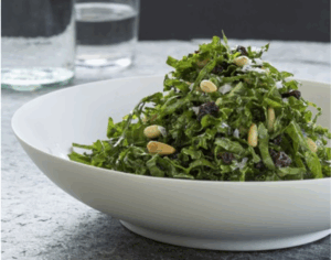 - Combine the kale, currants, and pine nuts in a salad or mixing bowl. Drizzle the salad with the vinaigrette and season with salt and pepper. Gently toss with your hands to dress the salad evenly, and let stand for about 10 minutes.